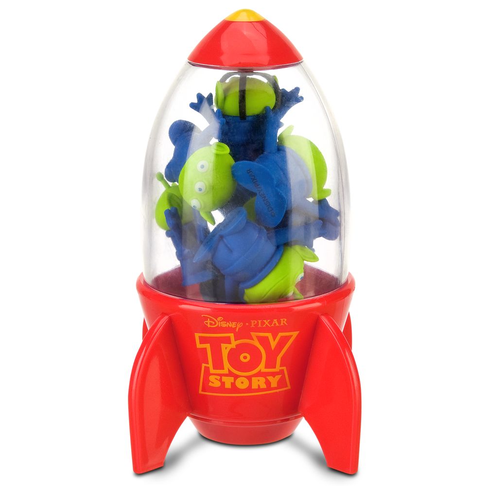 You get 8 erasers that are shaped like the little space aliens from Toy Story. The details in the photos look great. And they come in a rocket ship container that looks like the Claw Game at Pizza Planet, with a tiny claw at the top.